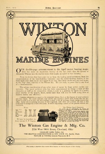 Detail of 1913 Ad Winton Marine Gas Engines Generator Cleveland - Original Print AdThis is an original 1913 black and white print ad for the Winton Gas Engine and Manufacturing Company, located at 2116 West 106th Street in Cleveland, Ohio.